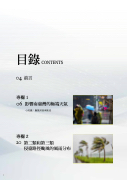 目錄 CONTENTS 04 前言 專欄 1 06 影響南臺灣的極端天氣 小知識:颱風與西南氣流 20 第二類和第三類 侵臺路徑颱風的風雨分布 專欄 2 2